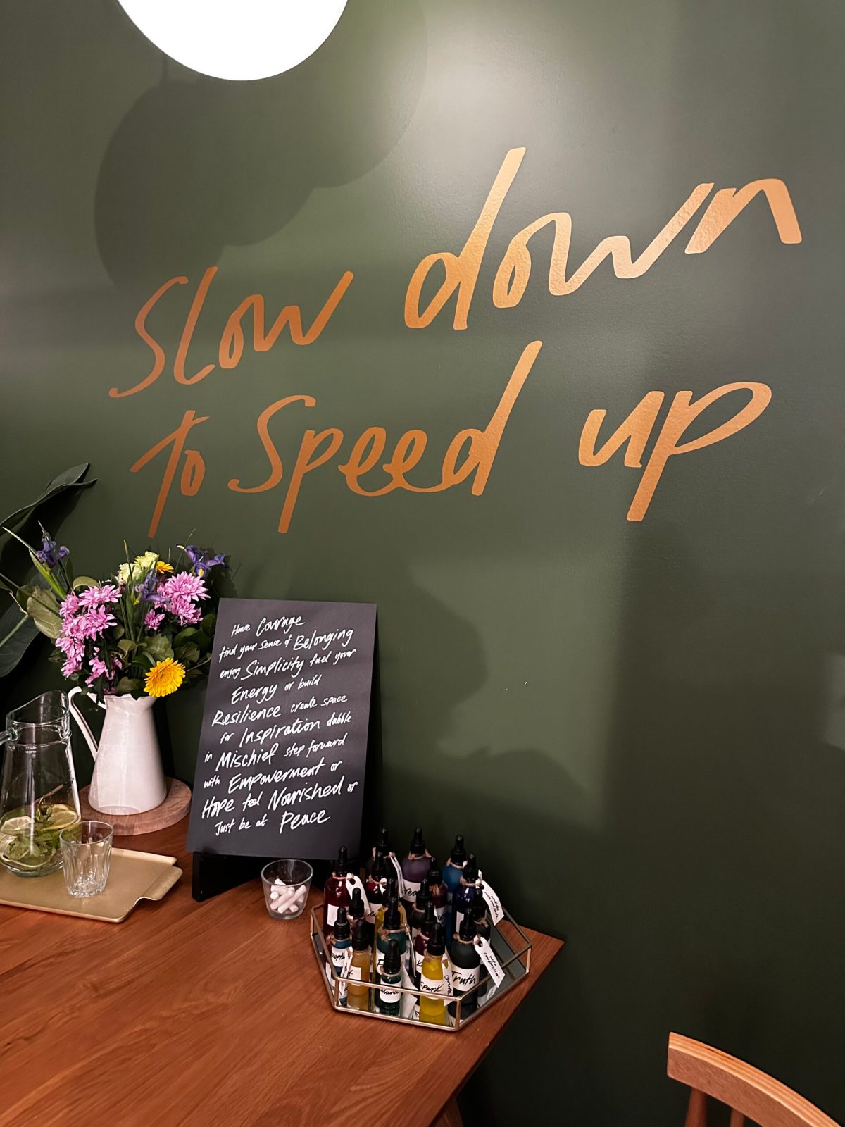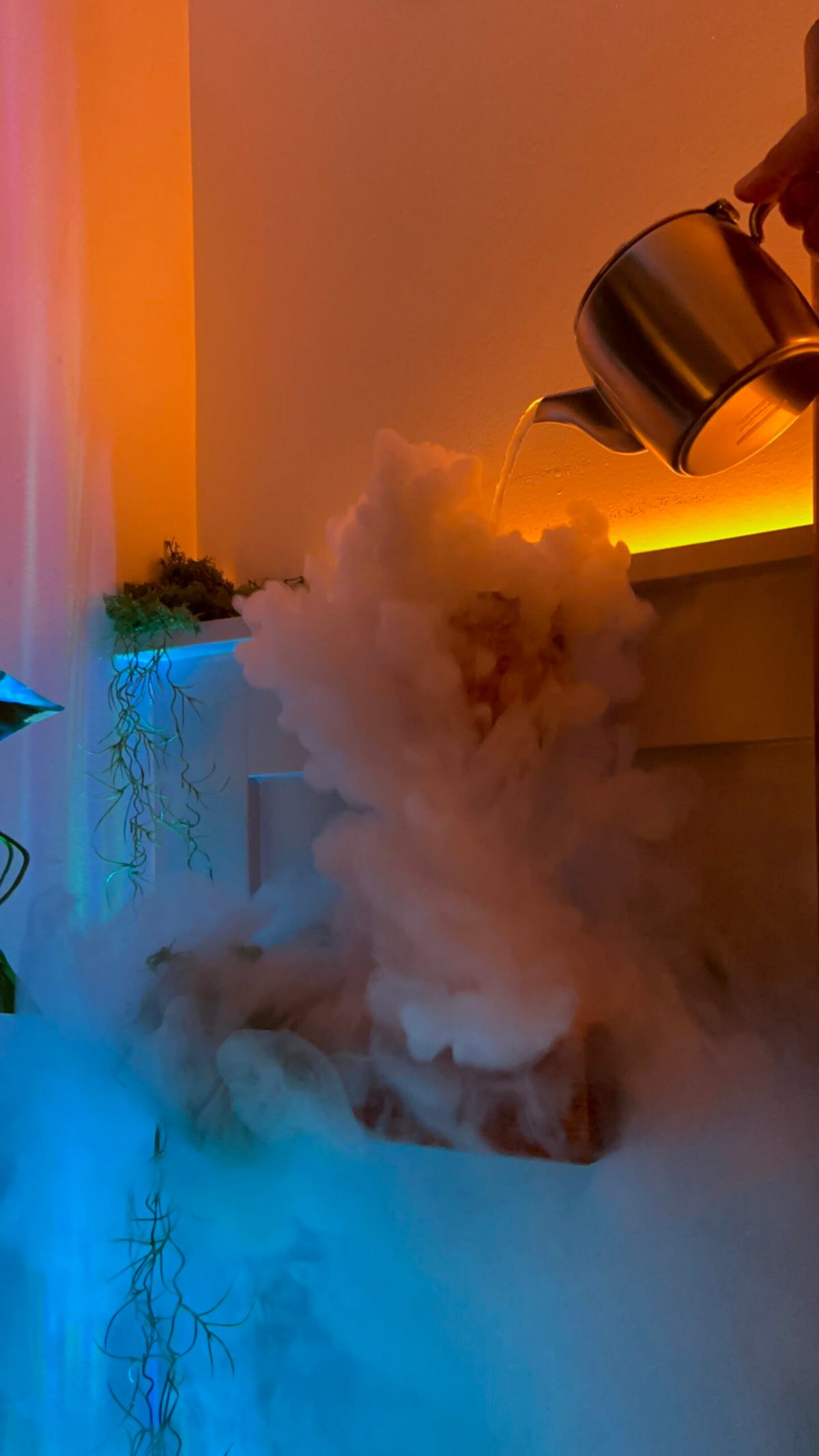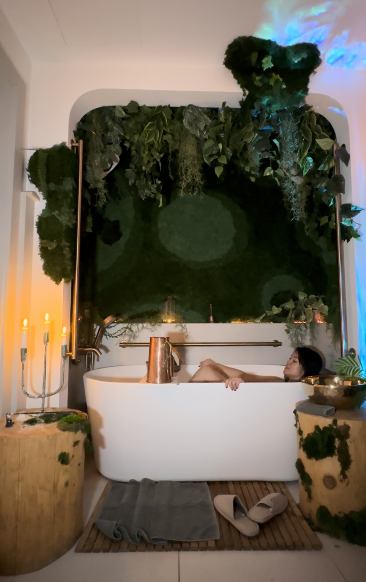 This is a self-led treatment and I was directed to a small room with a tub half full of water at 38 degrees. The setting was magical with faux greenery, wooden stumps as end tables, and dancing LED lights simulating moonlight reflecting off the surface of a serene lake. This was intended as a time and space to connect with nature and yourself.