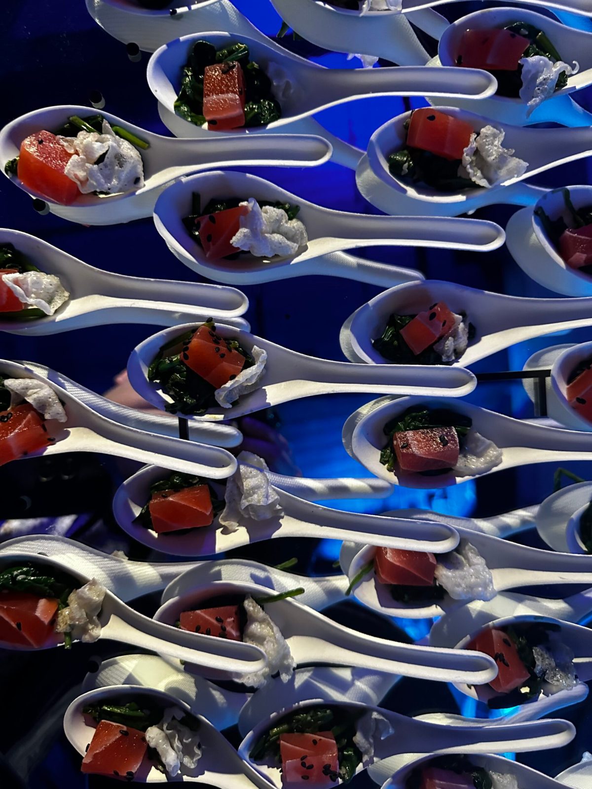 Zucchini, Peppers, Onion, Eggplant, Tomatoes, Buckwheat Sprout. This was 100% vegan and they went out of the way to recreate the salmon lines to have it as more of a compelling substitute for fish. The judges were all impressed, giving this one an honourable mention for most original dish.