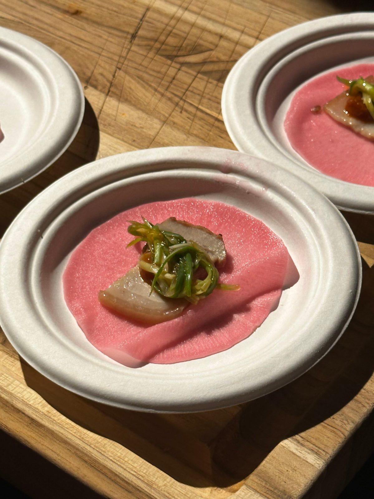 Another vegan and gluten-free option for fish. Only writing this now did I realize that the dish was smoked. We didn’t get that visual when visiting the station, nor did we taste it. I liked the thought behind it, but found the morsel bland and in need of soy or a salty dressing to perk it up, much like you would tuna Tataki.