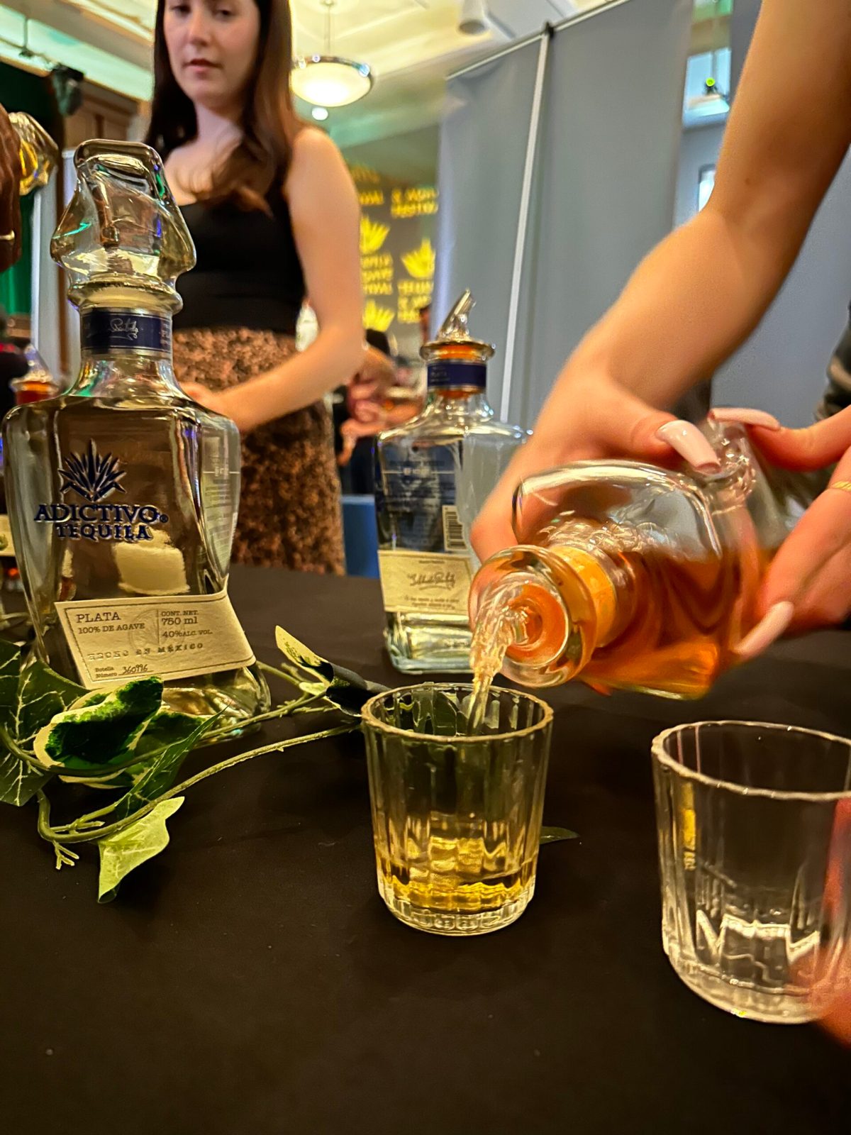 Each person received a small glass to take samples with and to take home as a souvenir. Not branded, but it interestingly enough had a cross etched at its bottom. Each booth was branded, and each brought their line of three tequila, tequilana (tequila made outside of Mexico), and/or mezcal for tasting. You bounced around trying what you liked. Each pour a tiny taster, but they added up, especially if you were sampling from the entire line. Thankfully there were pour out buckets and water stations to help keep pace.