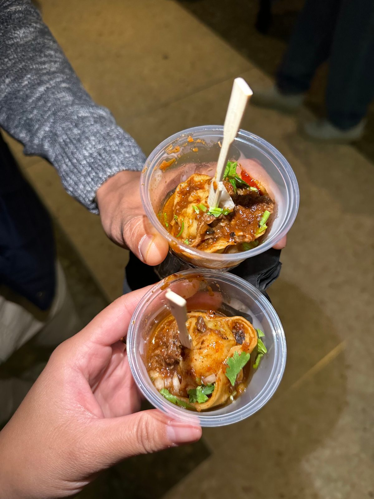 The local king and queen of dumplings: Dicky’s Dumps were steaming and topping their classic pork dumping with beef jus, raw onions, and green onions for a birria dumpling.