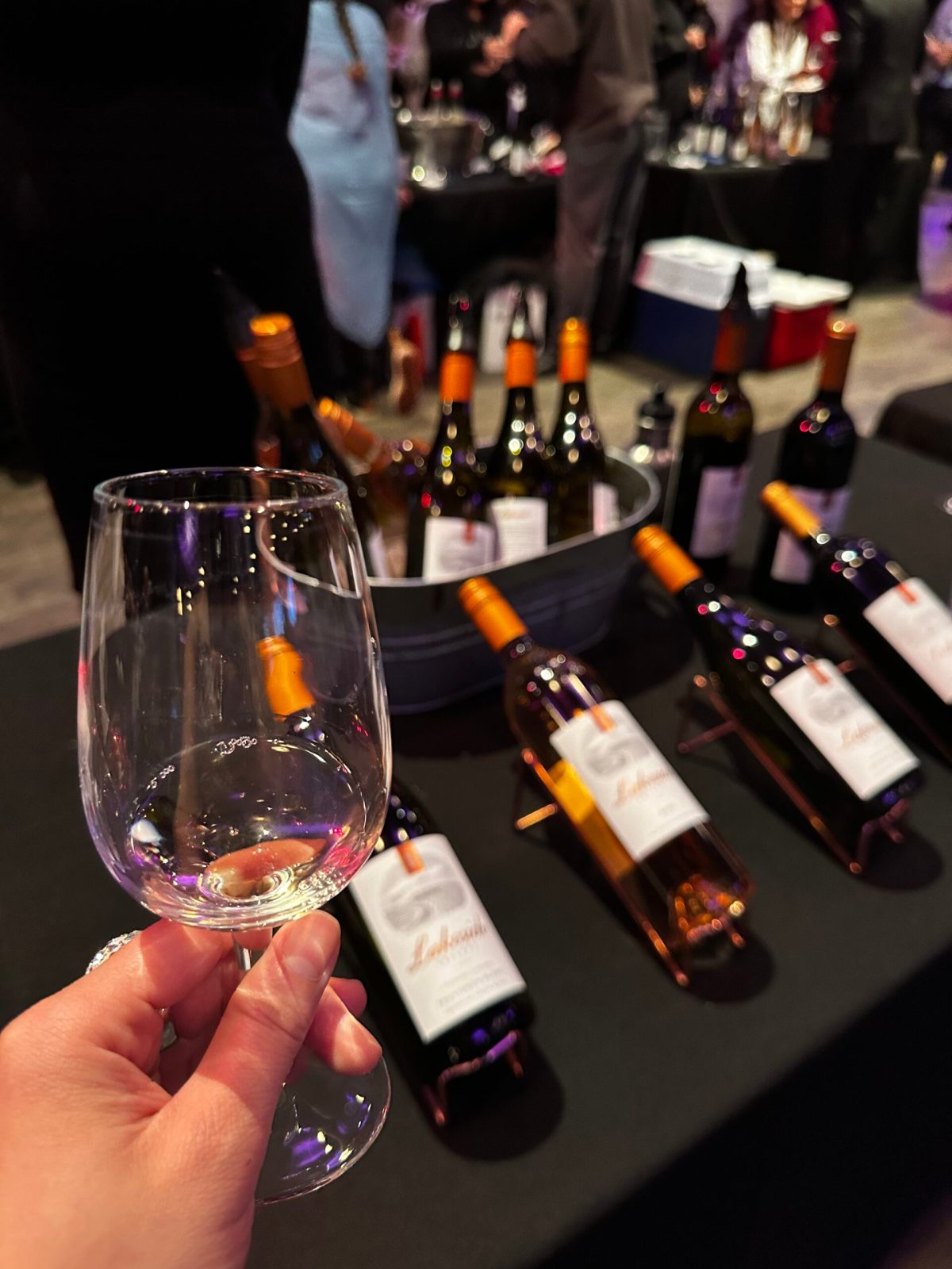 At the AmoVino Wine + Spirits table they were sampling Covert Farms Amicitia Red Blend, 2020 Covert Farms Rose, and 2022 Covert Farms Sauvignon Blanc Semillion.