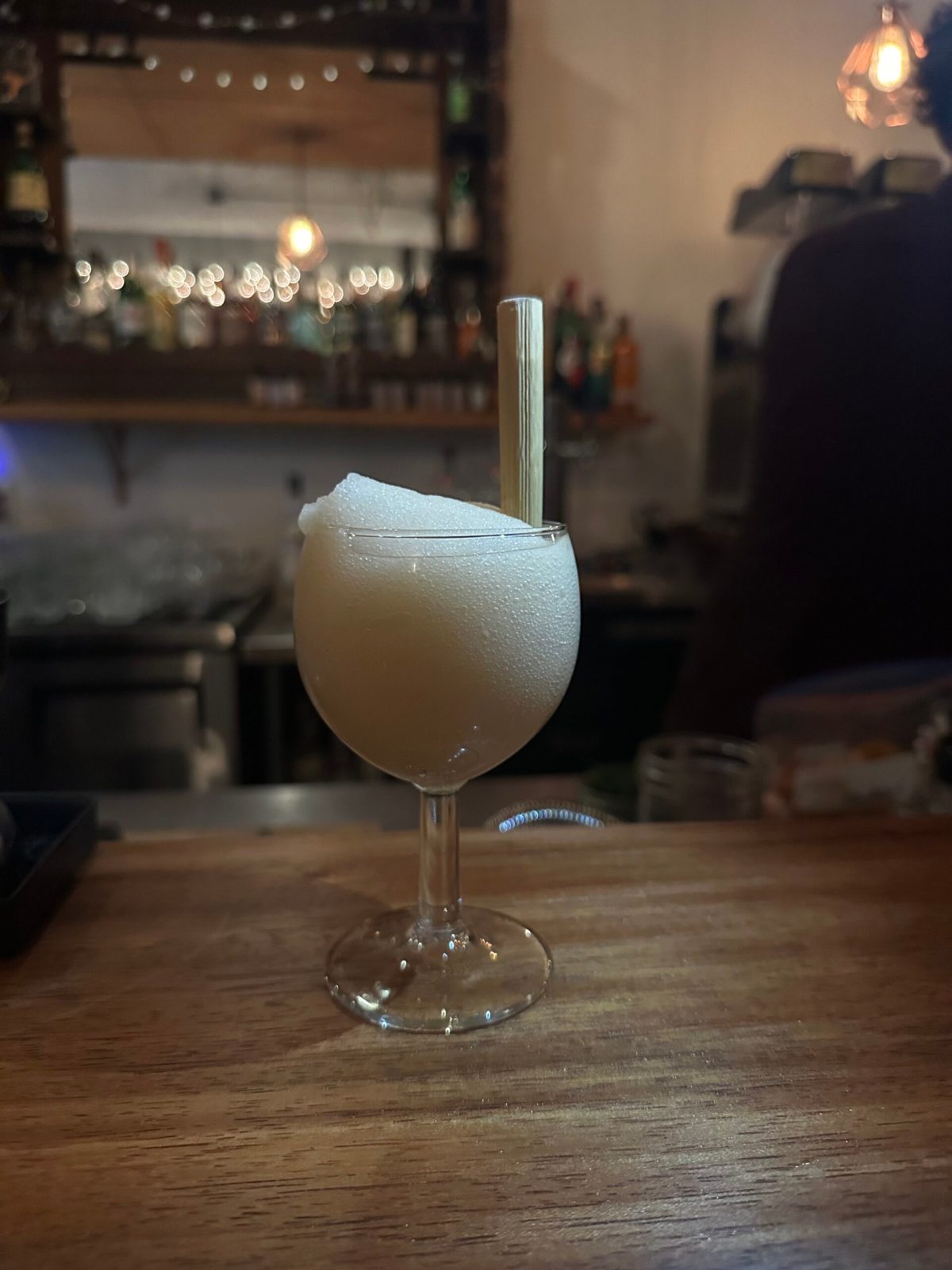 The Life on Earth is Amaro Chiaro, beet & dill vacuum distillate, mezcal, and blanco vermouth. The Woods uses vacuum distillate to create flavour profiles that other bars can’t, and we got a taste of that with the beet and dill flavour in this. The beets bleed pink into this otherwise clear liquid. It was fragrant and an easy sipper, with a medicinal sweetness and the freshness of dill that lingers. Also worth pointing out is the hand cut ice that they use and the artisan feel they put into all of their offerings.