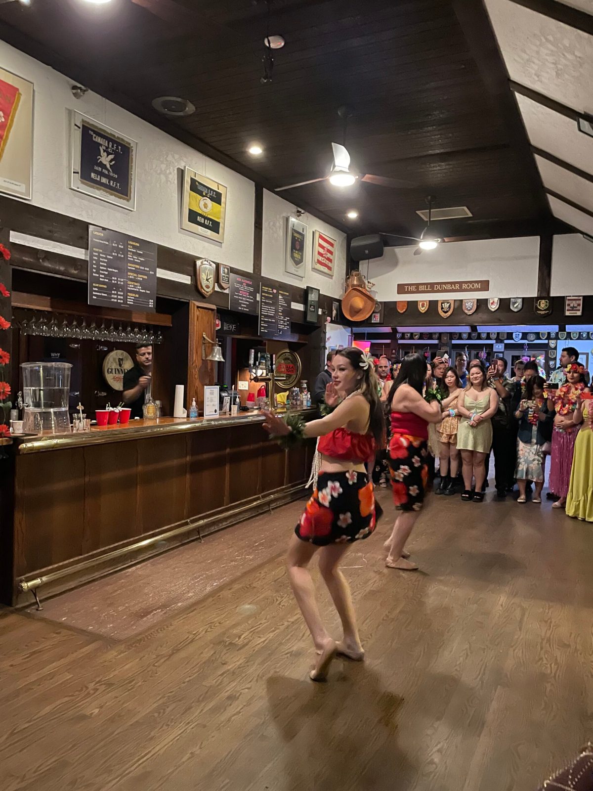 An “Aloha” poster marked the entrance with an employee seated at the door, checking off names. Here, it would have been nice to be given a lei, as is the customary and/or expected greeting at any Hawaiian themed function. However, as guests were invited to come dressed for the part, many attendees brought their own. A few incorporated hibiscus florals into their outfits, some men wore Hawaiian shirts, and a few women even had grass skirts.
