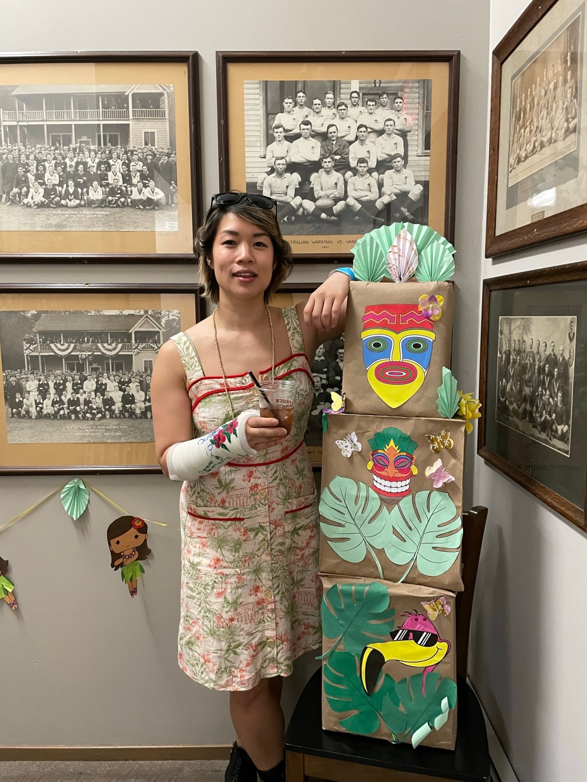 Paper garlands of pineapple and hula girls led those checked in, upstairs. Past a cake decorated like a flamingo (that we would not get to eat) and a homemade cardboard box tiki-totem.