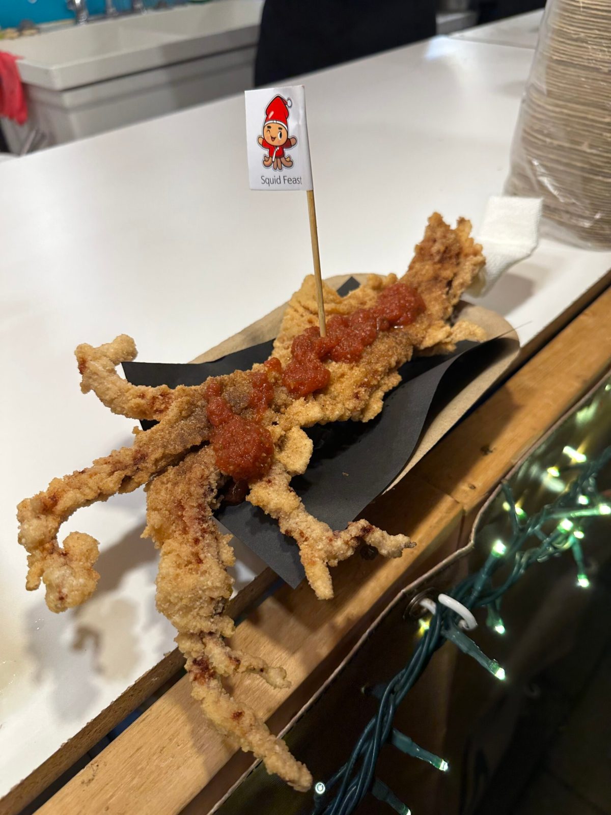 Not specifically German, but a Vancouver staple for most outdoor markets that serve food, is deep fried squid. Available as a half or a whole, as tentacle and rings, or as a solid piece presented on a skewer. We went for the latter, and although it was hard to share, I have no regrets. I enjoyed the pageantry of seeing a whole squid splayed out from its frying on to the stick.