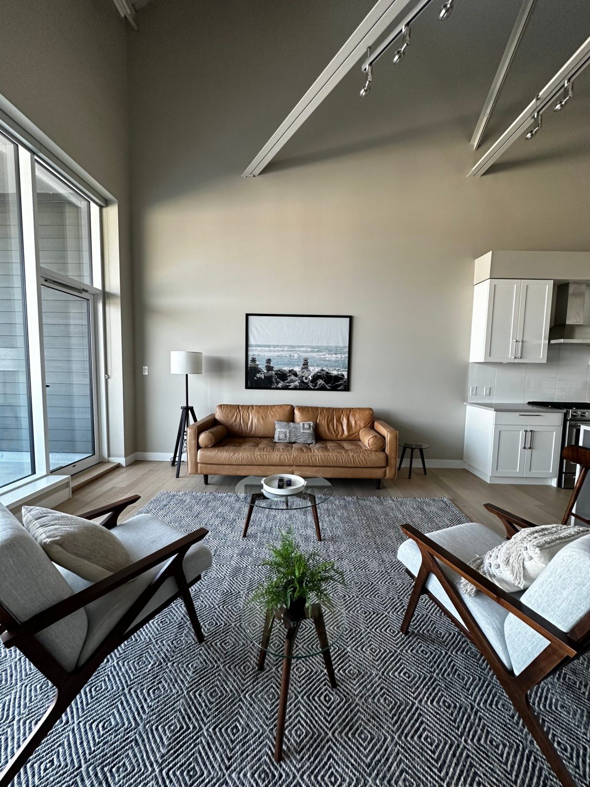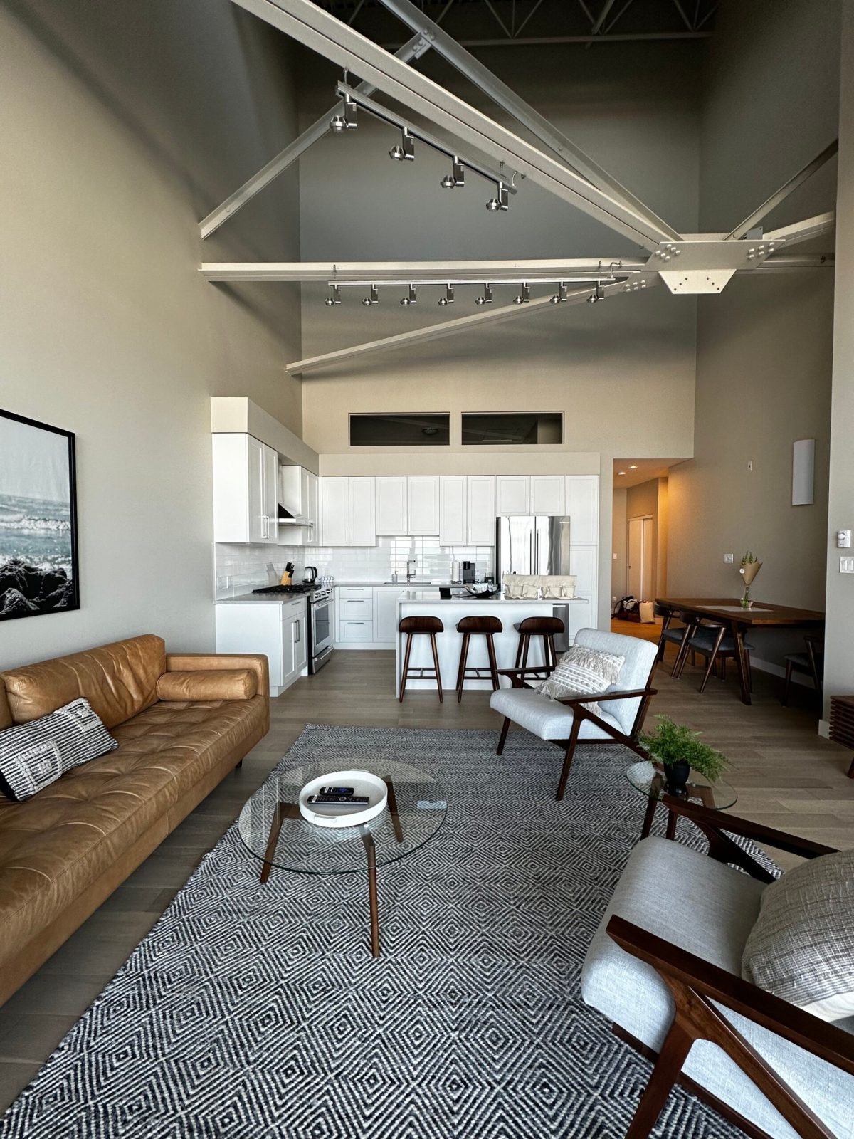 The suite is spacious with vaulted ceilings. Well designed and decorated, set in a neutral palate. The living room centred around the view from the large windows. Seating is cozy with a soft leather couch and plush chairs with glass top side tables.